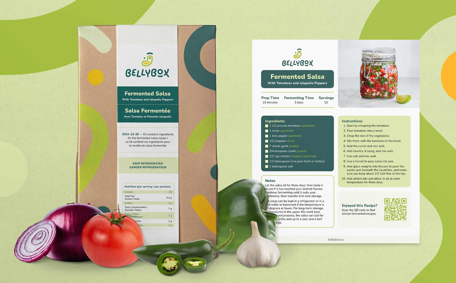 BellyBox is a hypothetical Canadian fermenting company and food-focused subscription box business that provides authentic organic recipes and handpicked ingredients. The brand is designed for fermented food enthusiasts and health-conscious individuals who are interested in supporting gut health through natural, at-home fermentation. My task was to create a full brand identity and design all items included in the subscription box.