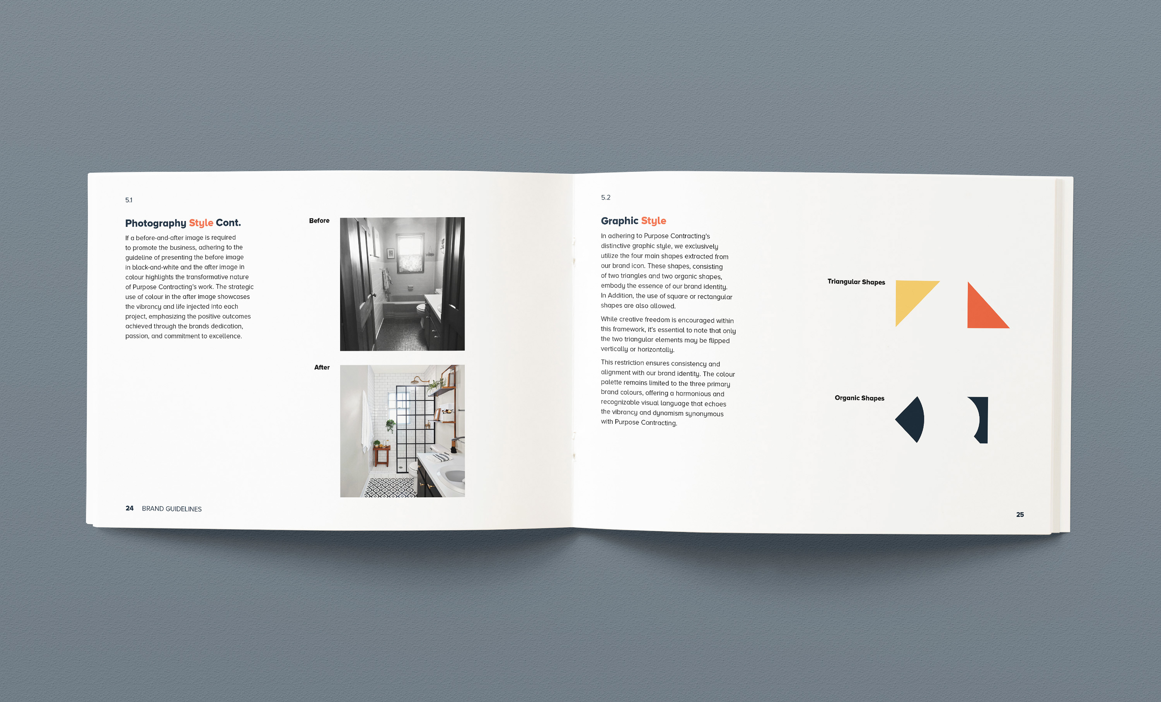 Once the brand assets were finalized, I created a brand book to act as a guiding document for the Purpose Contracting brand. This book outlines the rules and guidelines for using the brand while clearly reflecting their essence, vision, and purpose.
